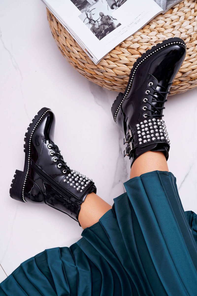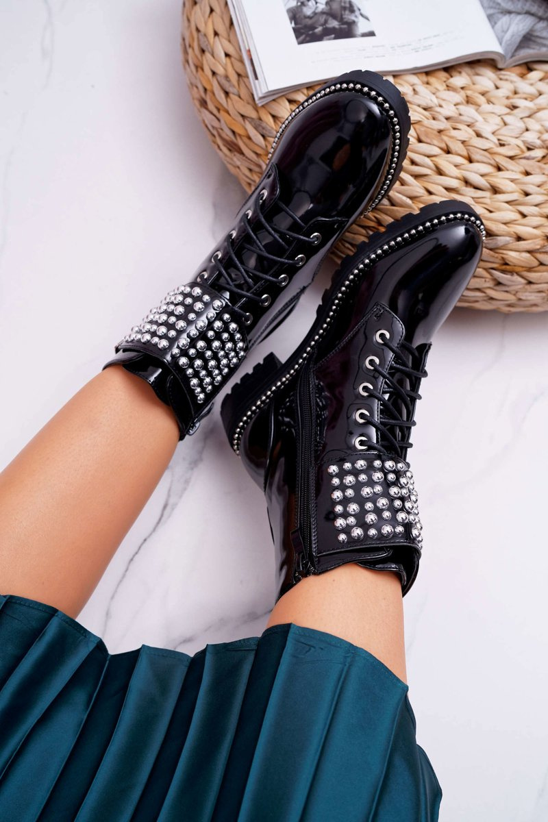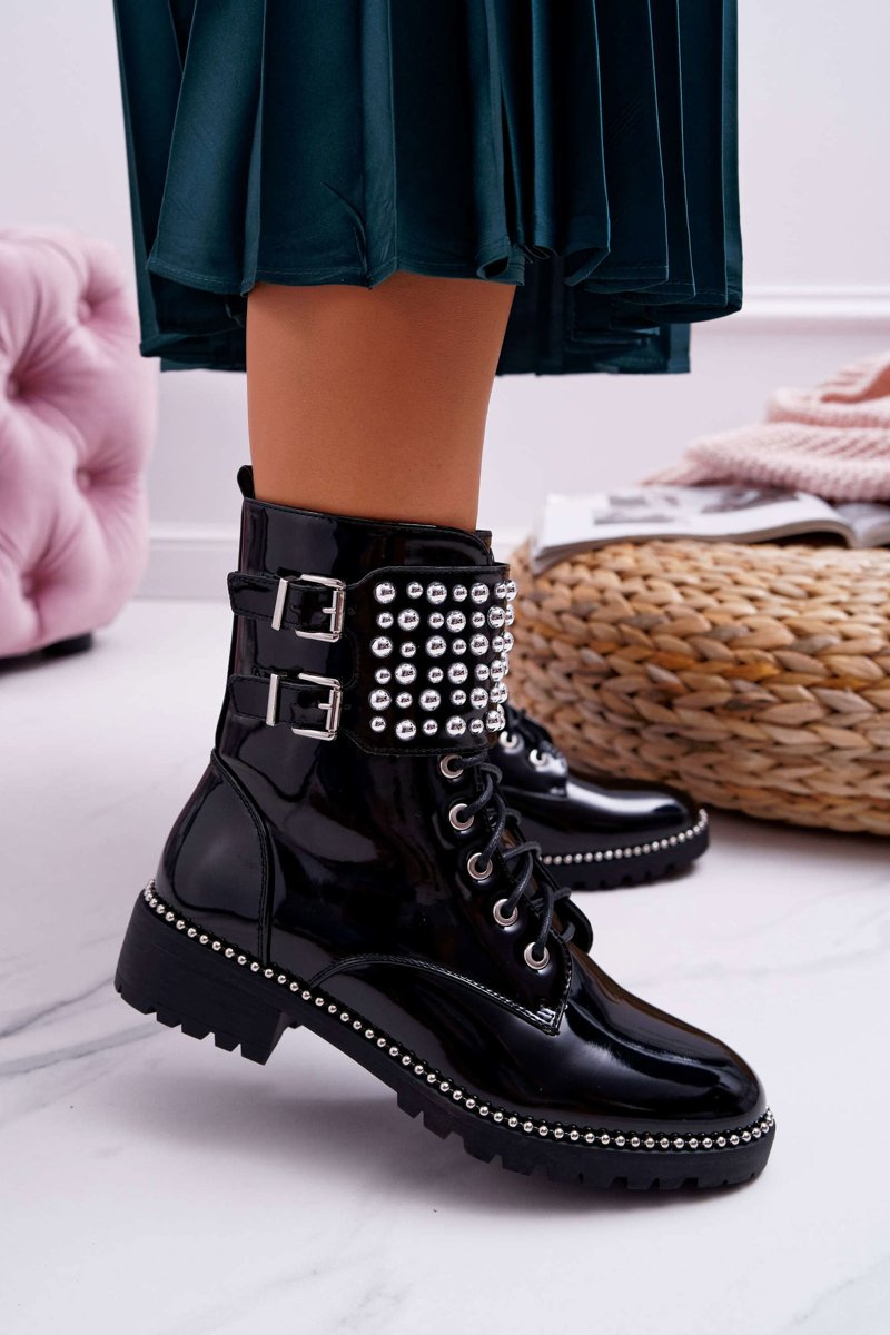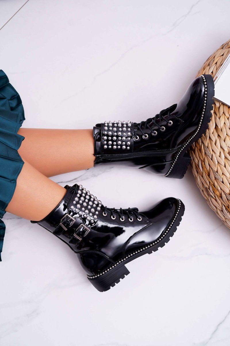 Botki Damskie Płaski Obcas Militarne Lakierowane Czarne Bemmer
