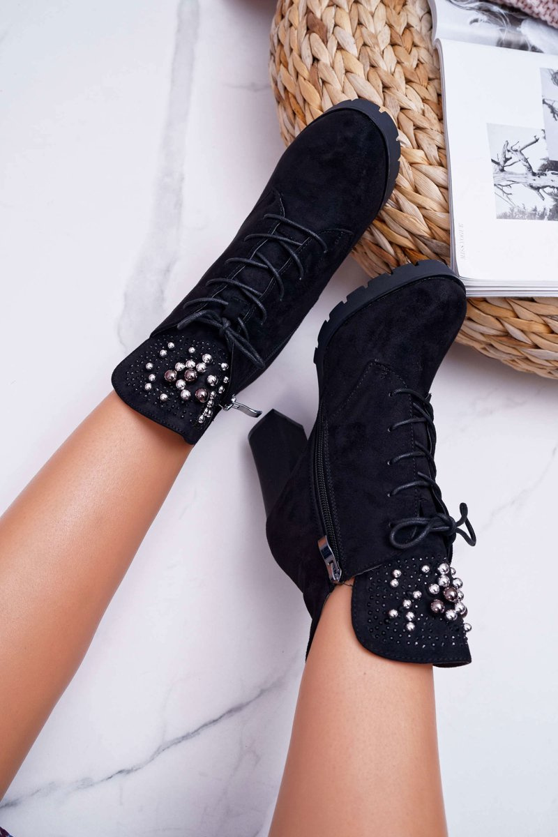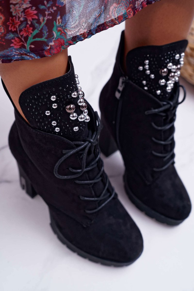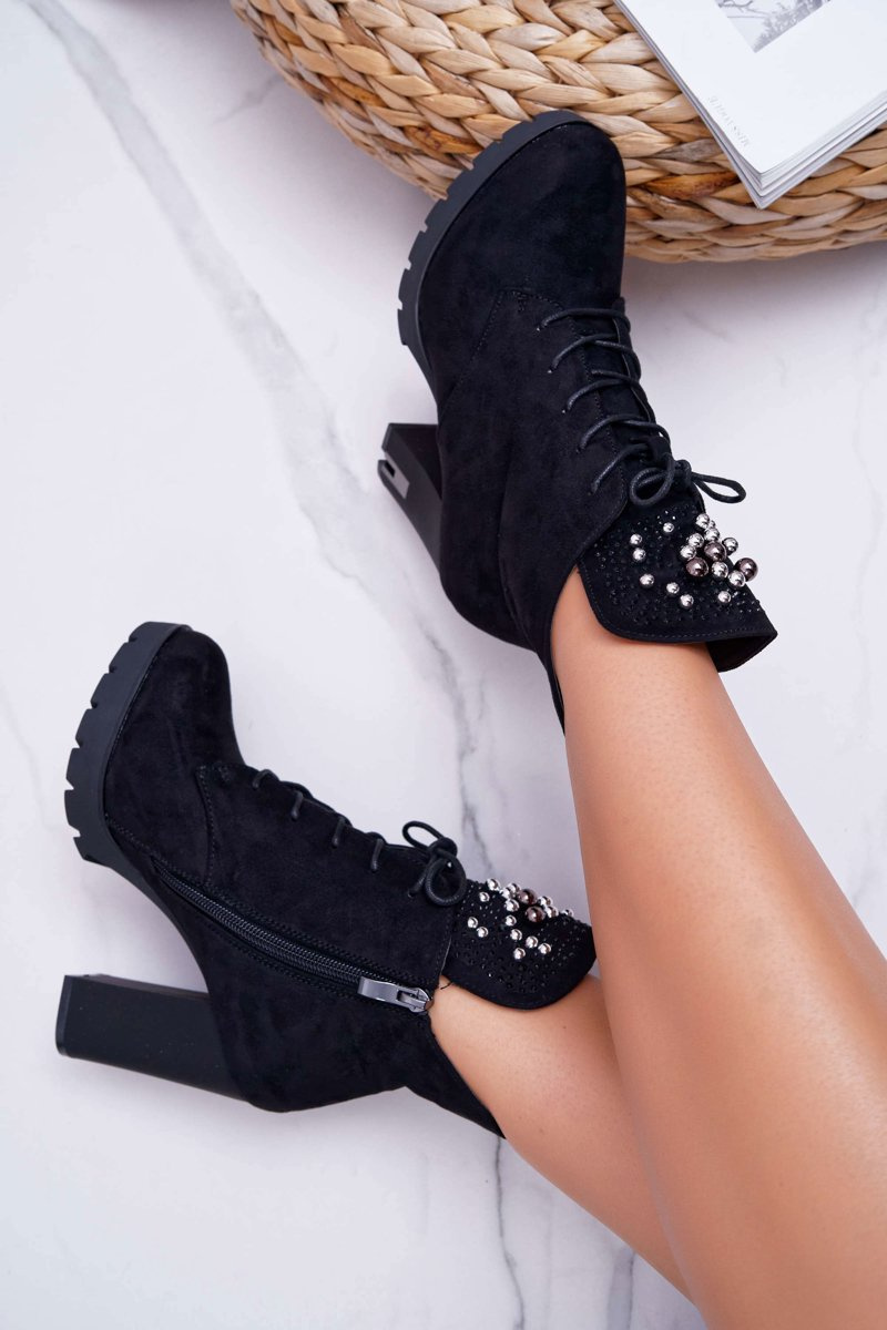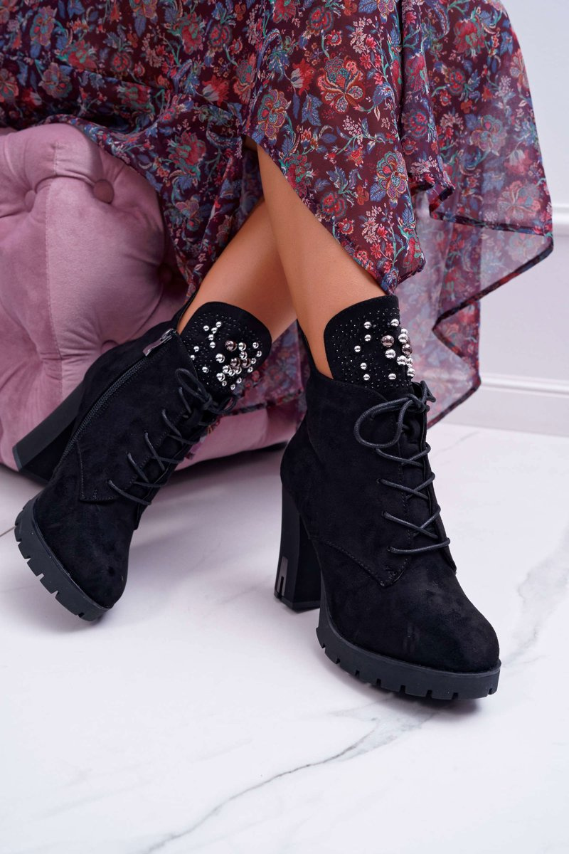Botki Damskie na Słupku Platformie Zamszowe Czarne Fieste