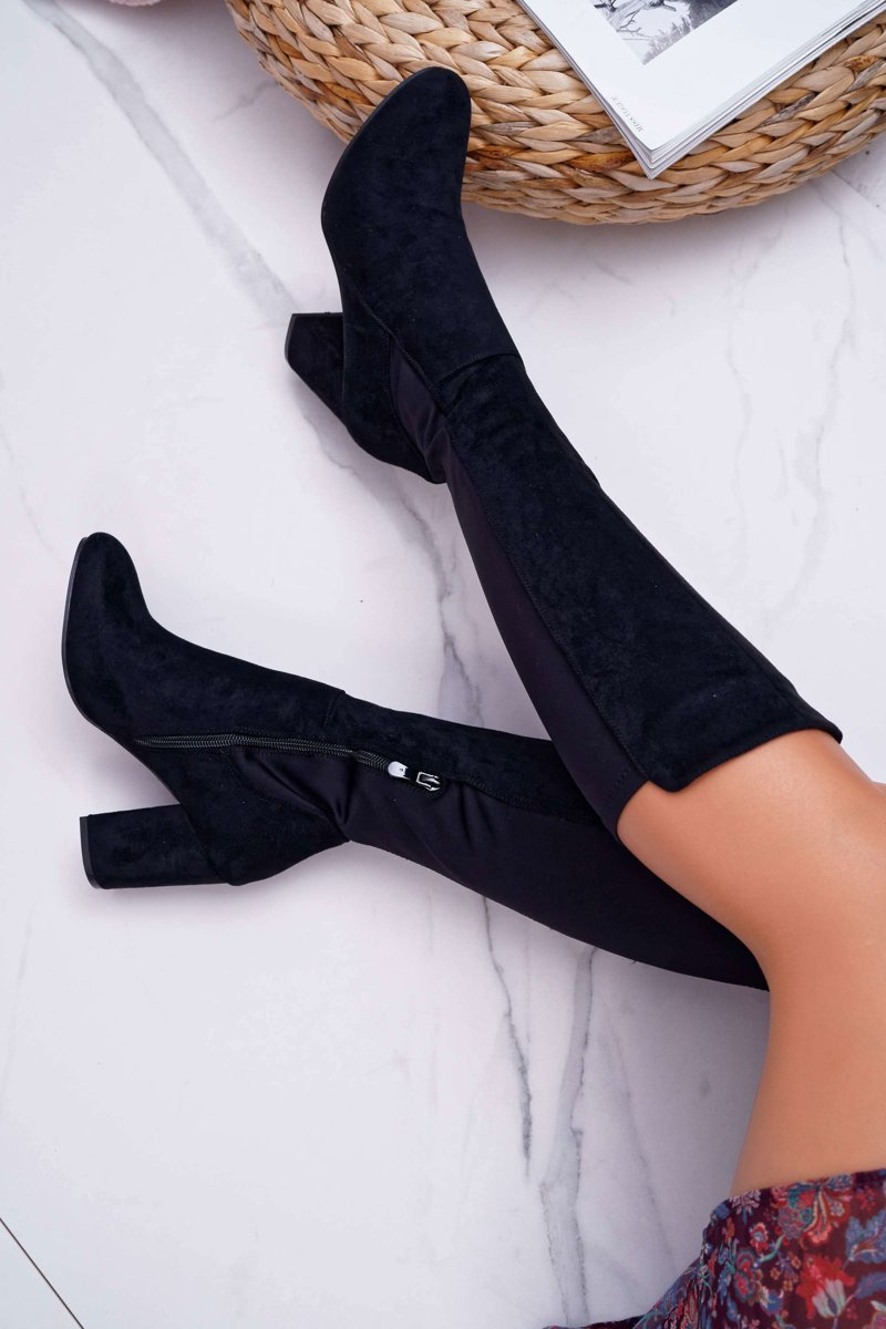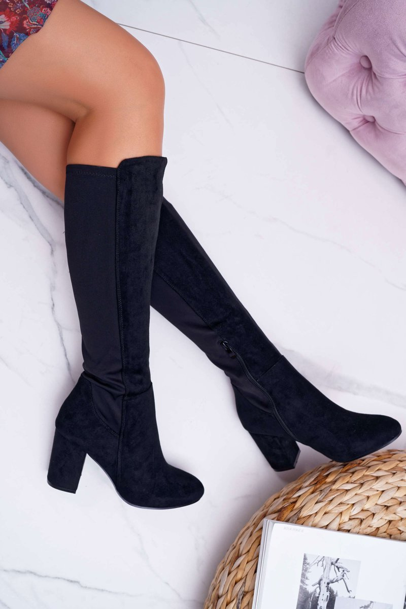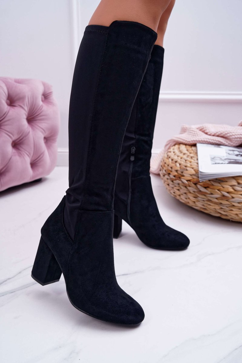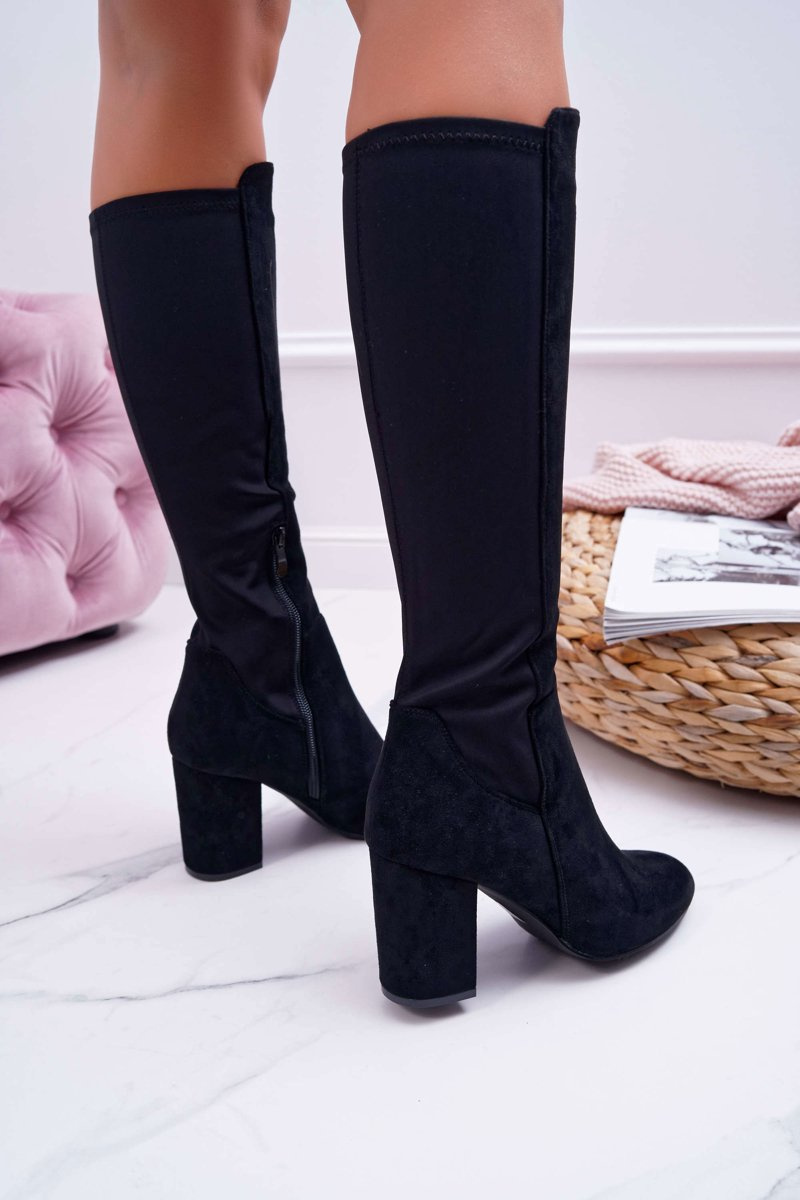 Kozaki Damskie Na Słupku Zamszowe z Lycrą Czarne Machine