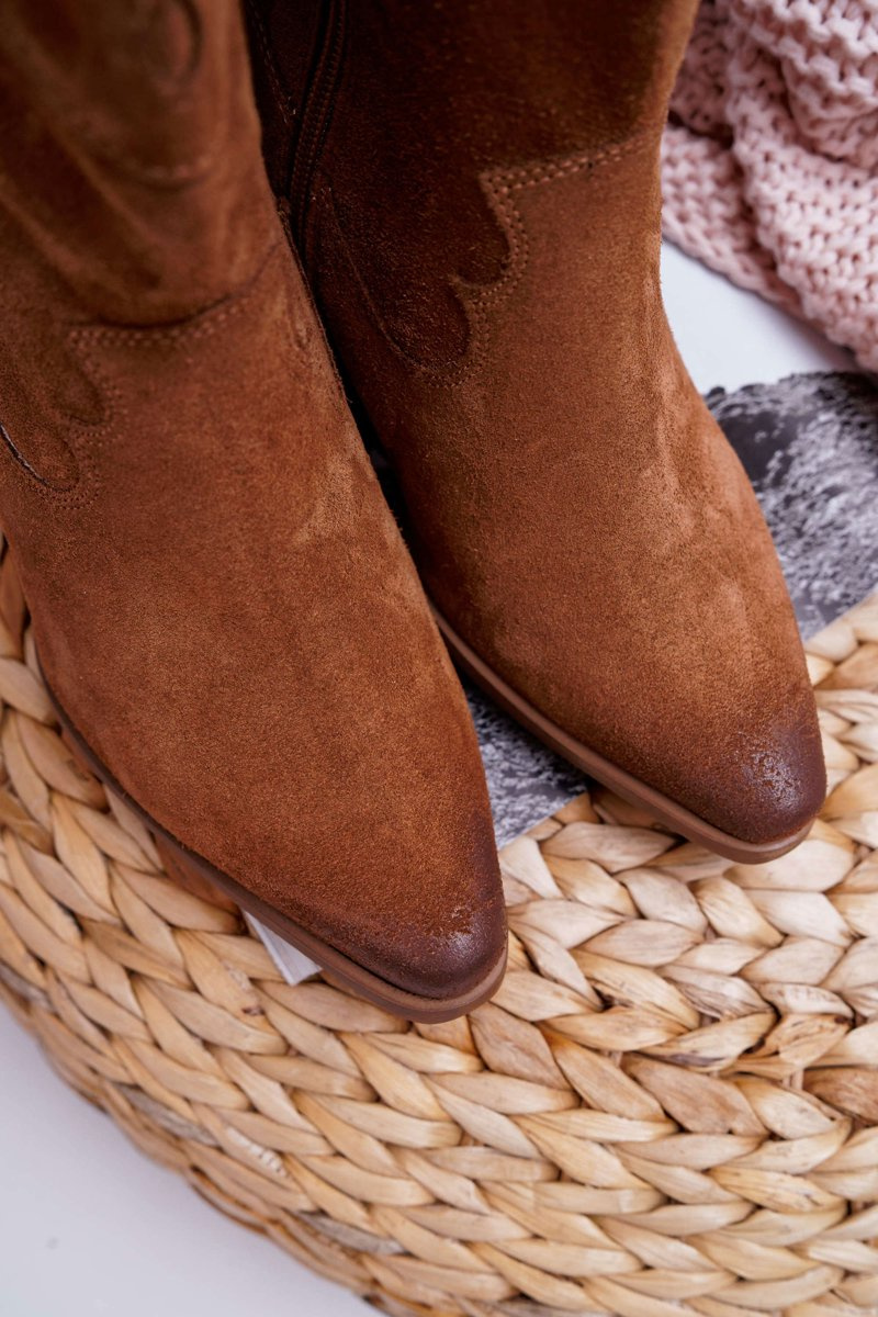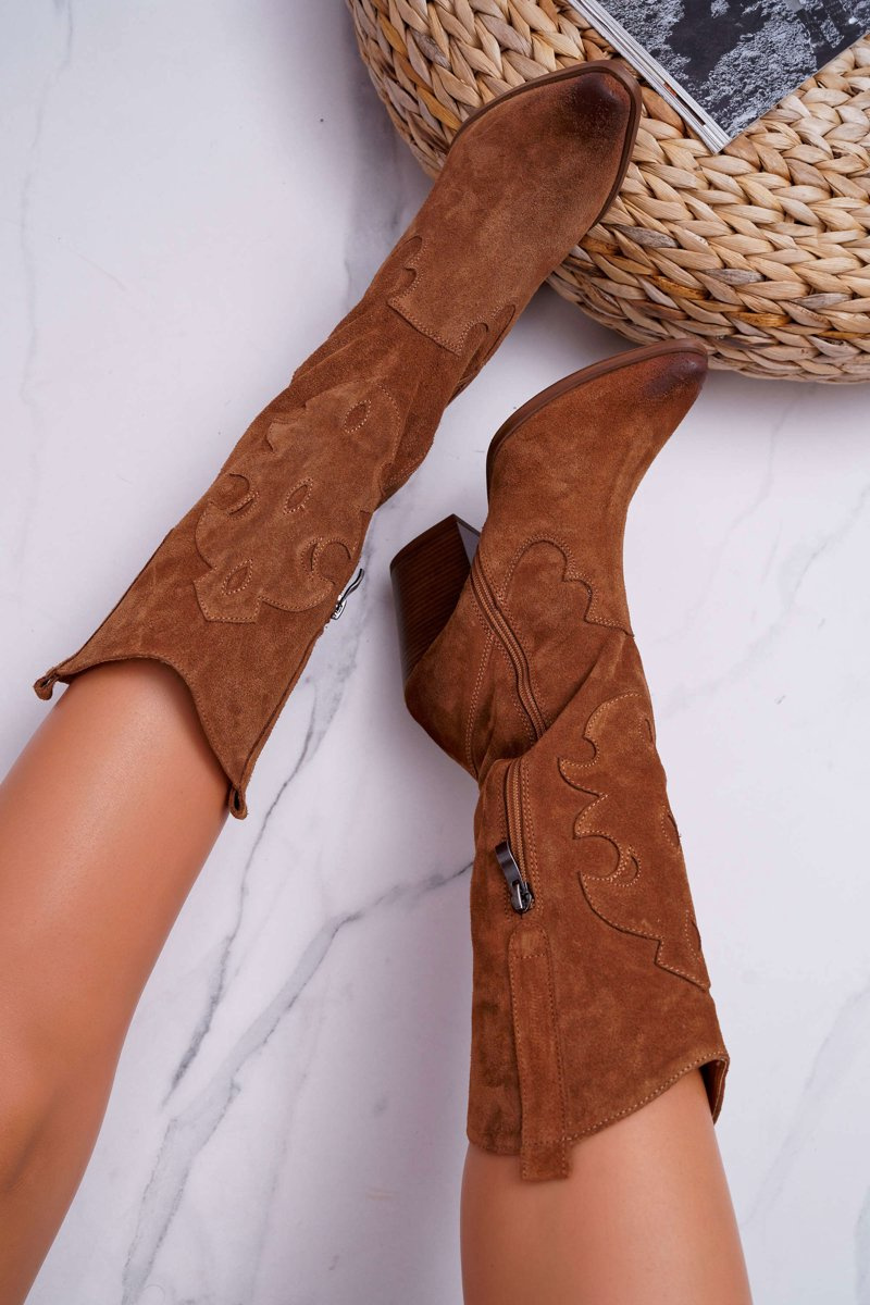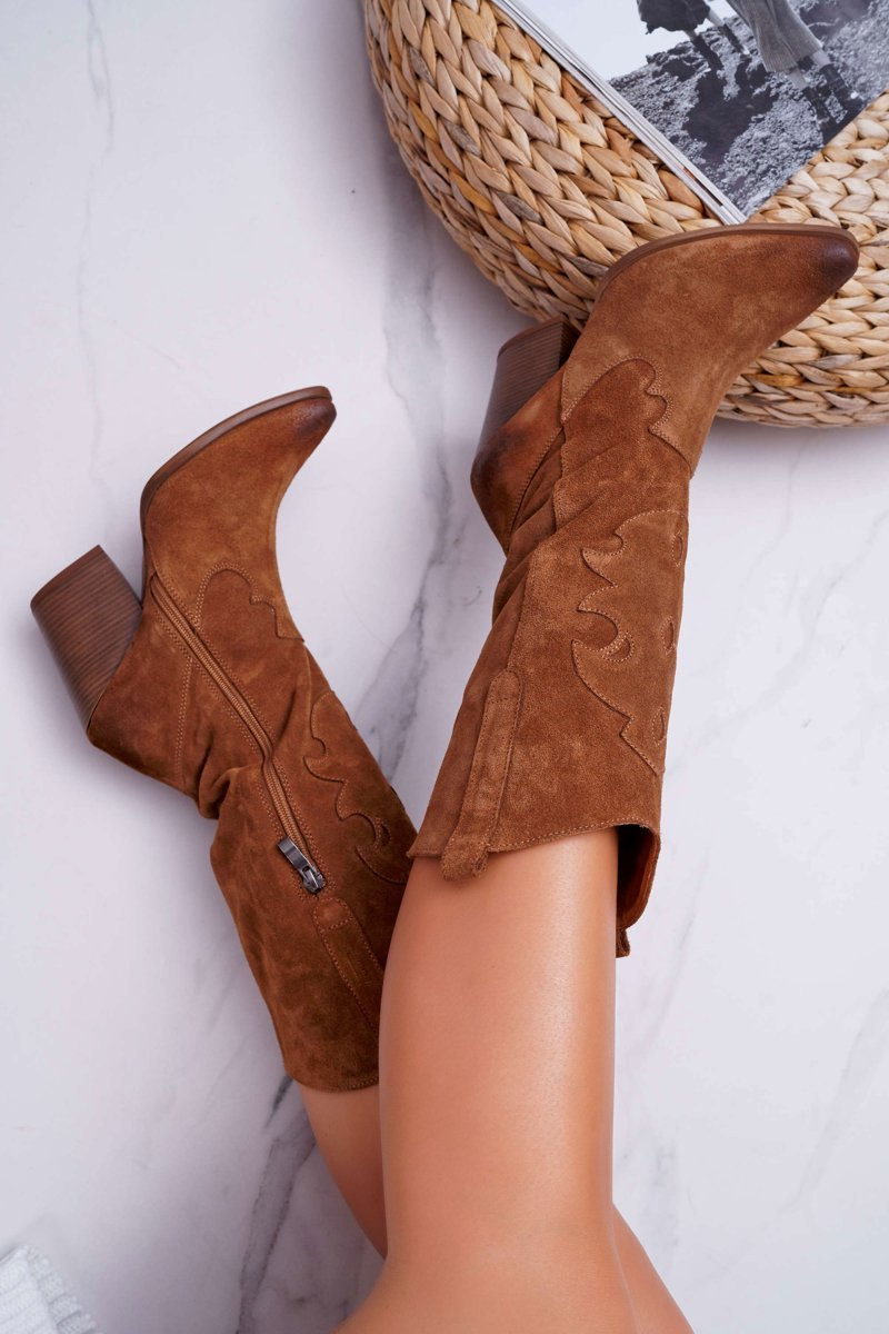 Kozaki Damskie Na Słupku Kowbojki Camel Brunt