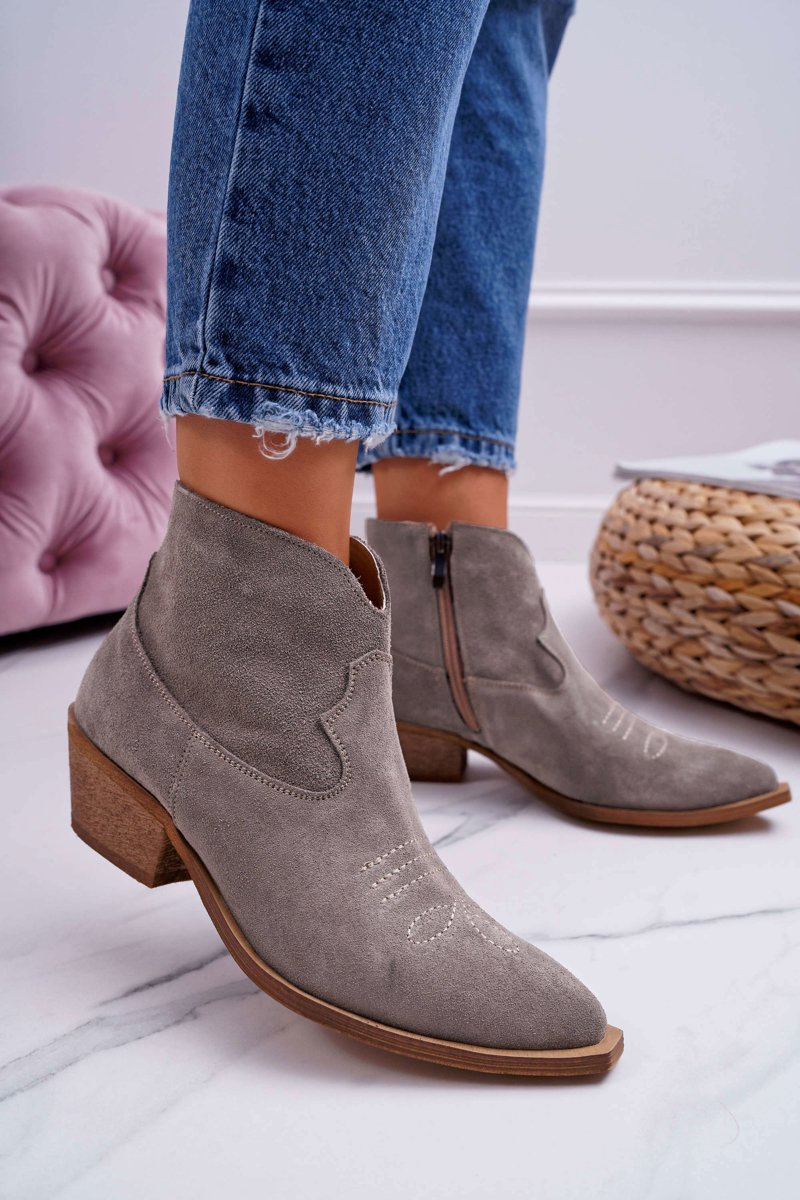 Botki to nie tylko buty na chłodne dni. Świetnie sprawdzą się również podczas tworzenia wiosennych lub jesiennych stylizacji. Produkt polski, wykonany w całości ze skóry zamszowej. Delikatny, 5cm płaski obcas uniesie Twoją sylwetkę i podkreśli stylizacje. Styl kowbojek nigdy nie wyjdzie z mody. Idealne do zwiewnych sukienek oraz jeansowych spodni. Przy wyborze rozmiaru prosimy sugerować się tabelą rozmiarów.