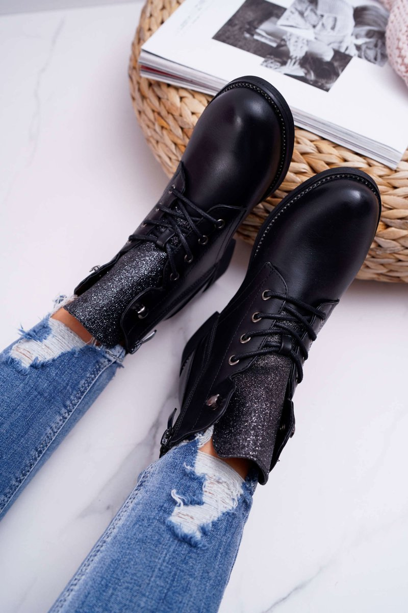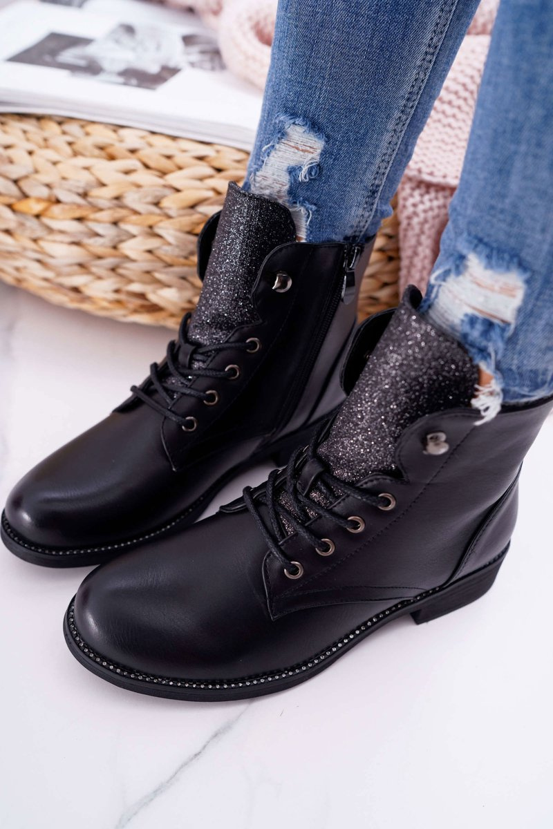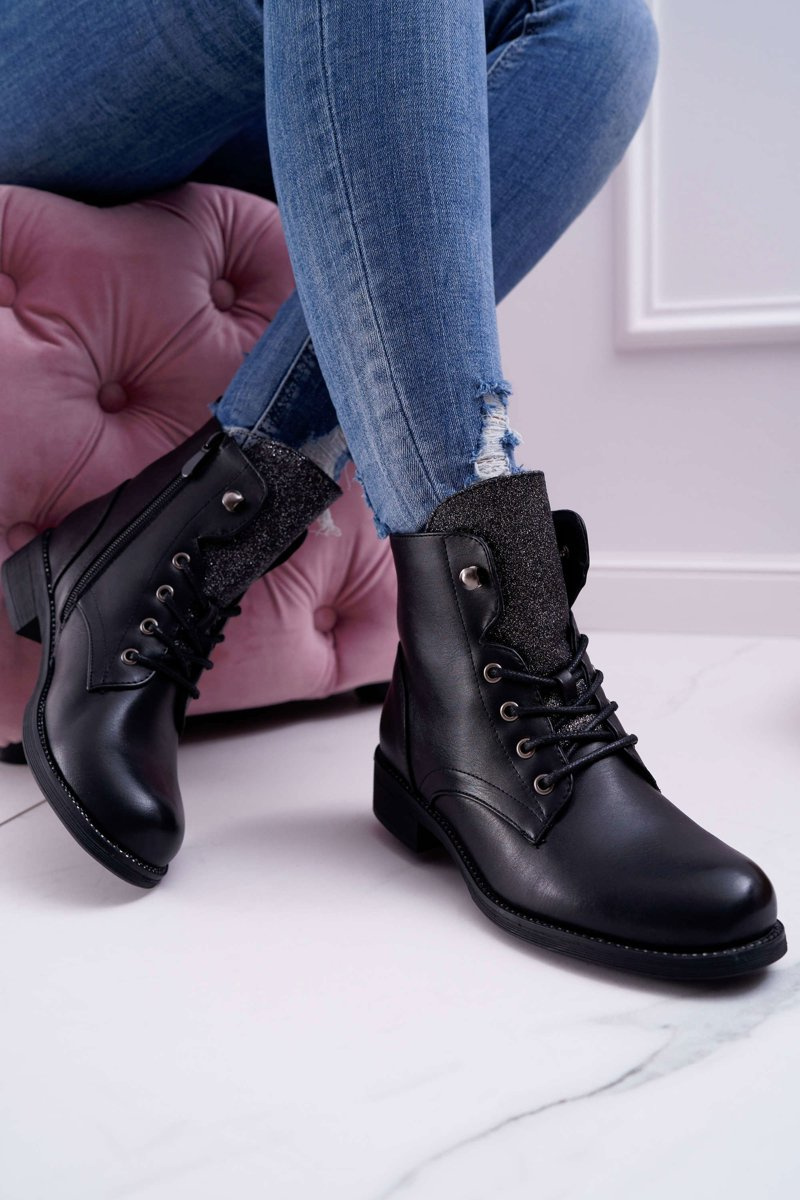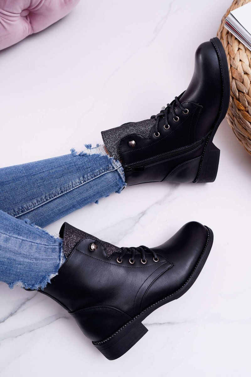Damskie Botki Workery Płaski Obcas Czarne Flumen