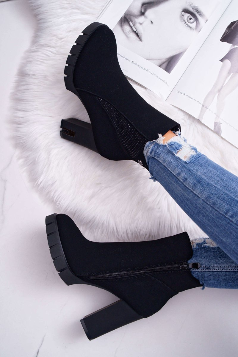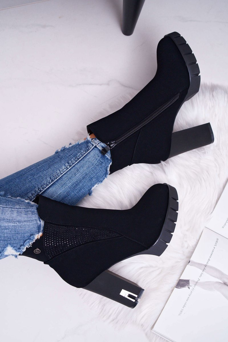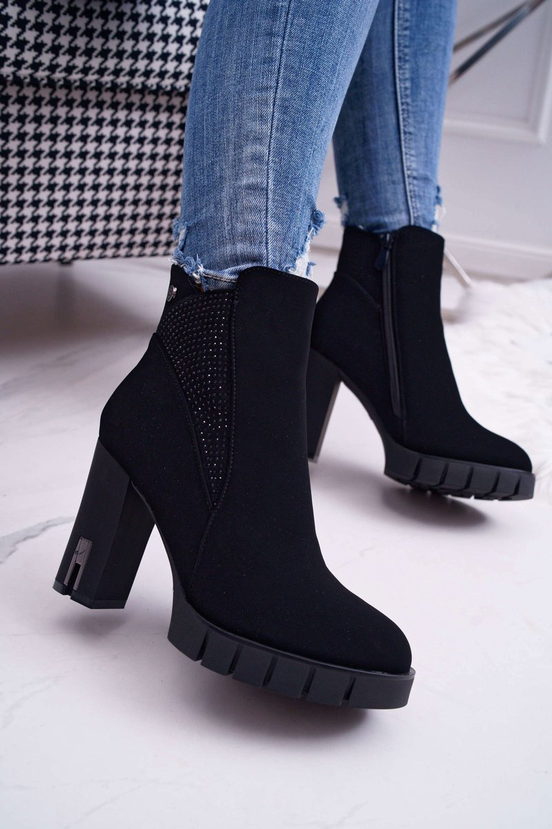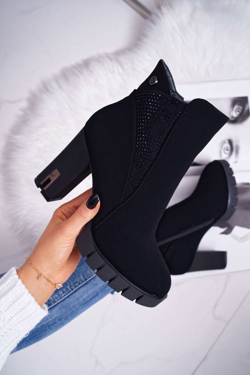 Botki Damskie na Słupku Platformie Z Cyrkoniami Czarne Deren