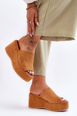 +1Damskie Klapki Zamszowe Na Platformie Camel Festil
