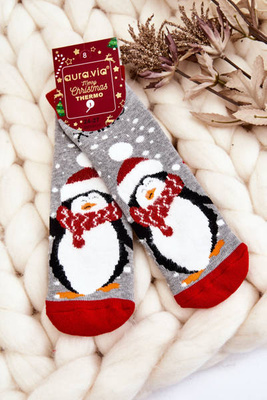 Dziecięce Świąteczne Bawełniane Skarpety Termoaktywne Pingwin Szare
