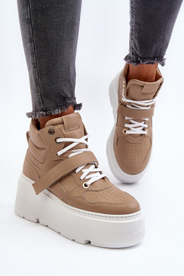 +4Damskie Buty Sportowe Skórzane na Platformie Beżowe Lemar 10150