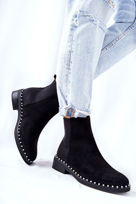 Zamszowe Botki Sztyblety Z Perełkami Czarne Jilanna