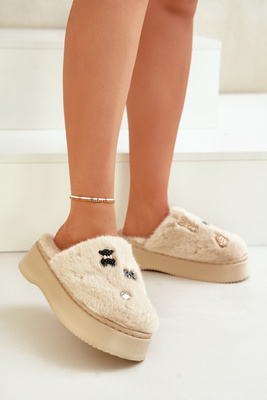 Futrzane Kapcie Damskie Na Grubej Podeszwie Z Przypinkami Beżowe Zintoria