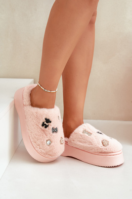 Futrzane Kapcie Damskie Na Grubej Podeszwie Z Przypinkami Różowe Zintoria