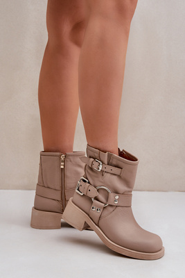 Skórzane Botki Damskie Na Niskim Obcasie Klocku Z Paskami Zazoo 3644 Beżowe