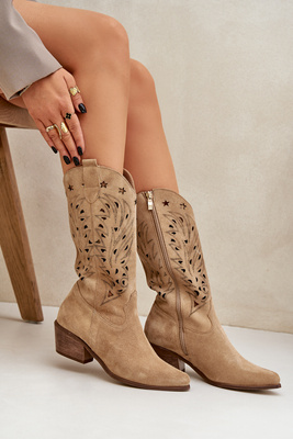 Zamszowe Kozaki Z Ażurową Cholewką Zazoo 3714 Beżowe