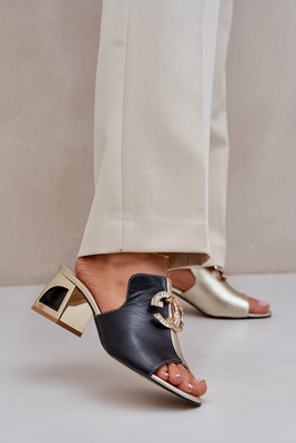 Eleganckie Skórzane Klapki Na Obcasie Laura Messi 2875 Czarno-Złote
