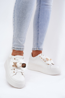 Sneakersy Damskie Z Kokardką I Broszką Z Misiem Białe Leathria