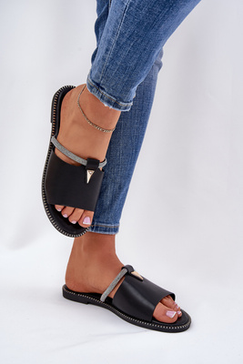 Eko Skórzane Klapki Na Płaskim Obcasie Z Ozdobnym Paseczkiem Czarne Hirtewi