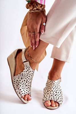 Skórzane Ażurowe Sandały Na Koturnie Beżowe Sellena