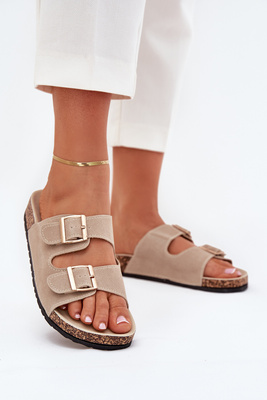 Klapki Damskie Ze Złotymi Klamrami I Przeszyciami Beżowe Lunera