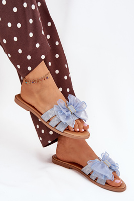 Klapki Damskie Na Płaskim Obcasie Z Tiulową Kokardą Jeansowe Tanira