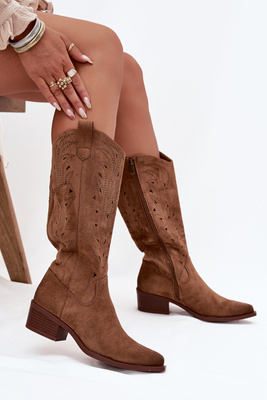 Kozaki Kowbojki Z Ażurowym Wzorem Na Niskim Obcasie Khaki Selirae