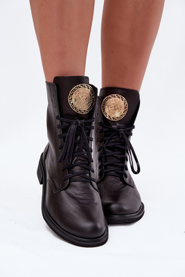 Skórzane Botki Damskie Na Płaskim Obcasie Ze Złotym Detalem Zazoo 3084 Czarne