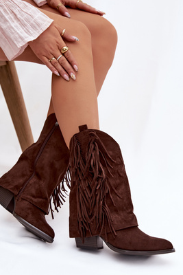 Botki Kowbojki Damskie Z Frędzlami Na Słupku Czekoladowe Gralina