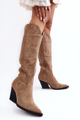 Modne Zamszowe Kozaki Kowbojki Beżowe Delia
