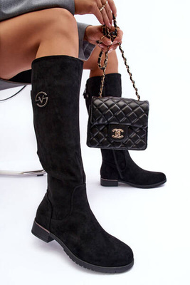 +1Zamszowe Kozaki Damskie Na Płaskim Obcasie Czarne Albuna