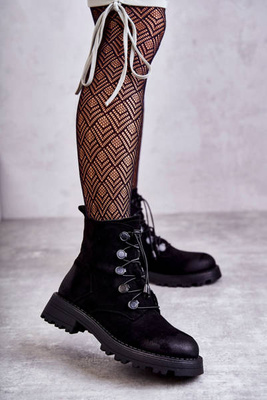 Skórzane Ocieplane Botki Workery wiązane Czarne Maria