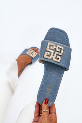 Klapki Damskie Jeansowe Na Płaskim Obcasie Z Ozdobą Niebieskie Inaile