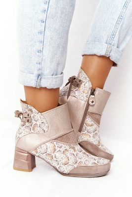 Damskie Skórzane Botki Na Słupku Maciejka Złoto Beżowe 03963-20