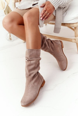 +1Damskie Kowbojskie Botki Na Słupku Zamszowe Cappuccino Emily