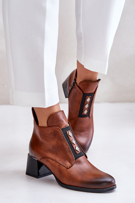 Zazoo 60504 Skórzane Botki Na Klocku Ocieplane Brązowe
